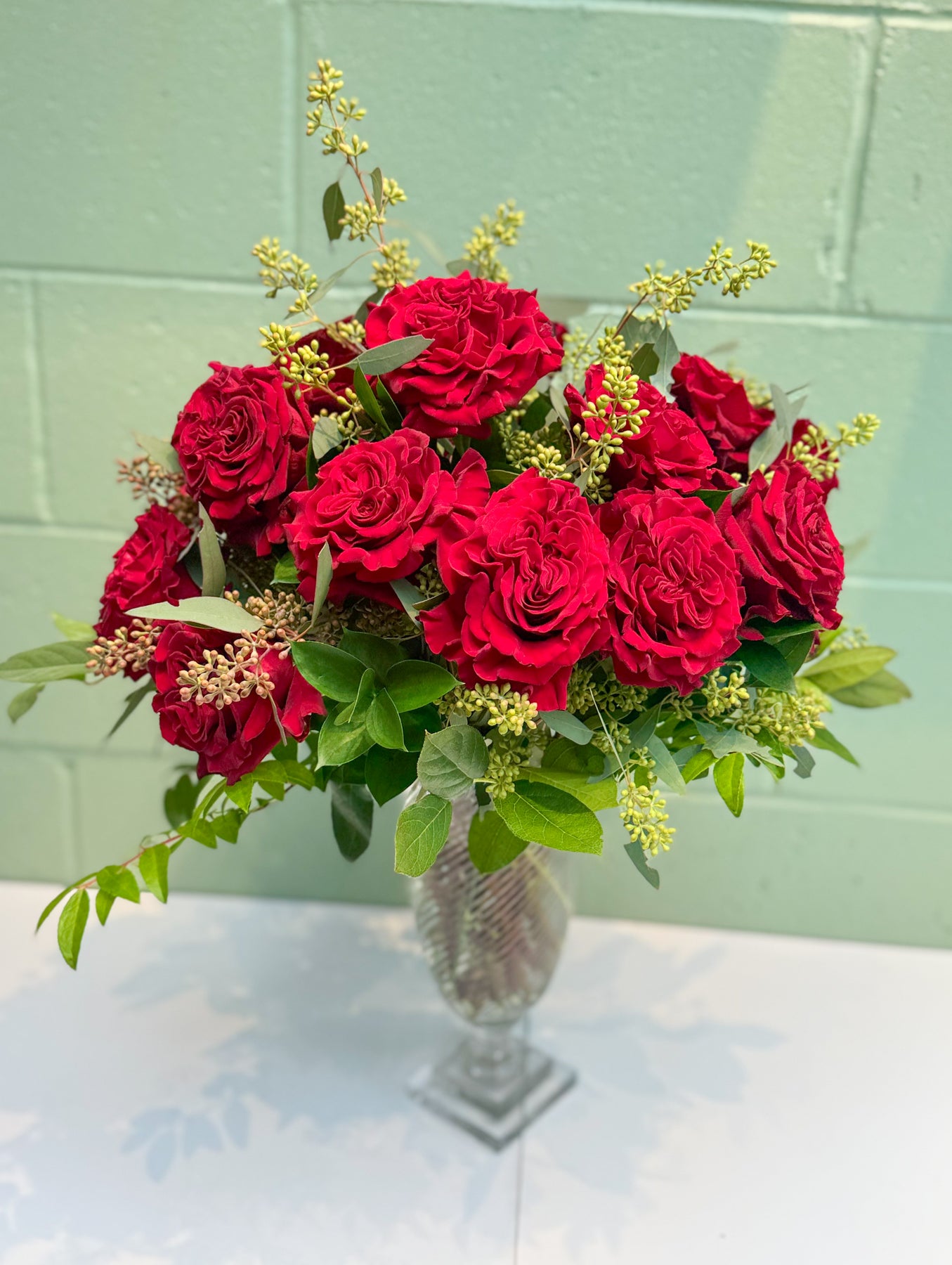 Our 18 rose arrangement is a romantic and refined take on a classic favorite. Featuring eighteen premium roses arranged with fresh greenery in a vase, this design offers a full, elegant look and makes a timeless Valentine’s Day statement.